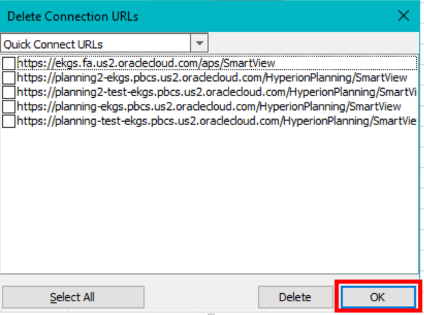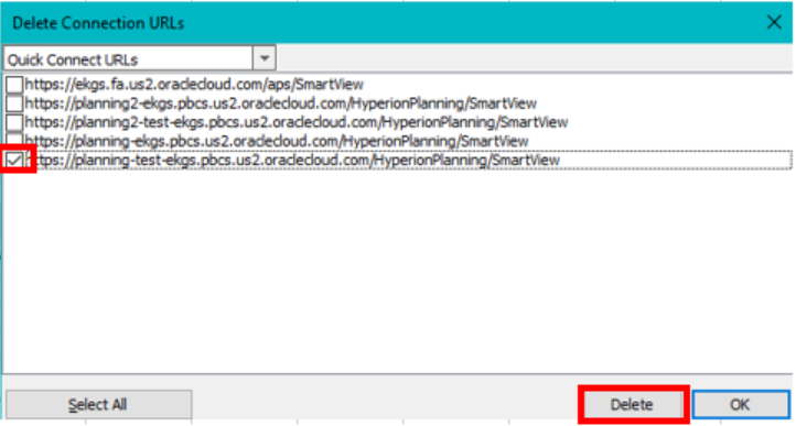 4. In the Delete Connection URLs dialog box, select the check box next to the URLs to delete, and then click Delete: