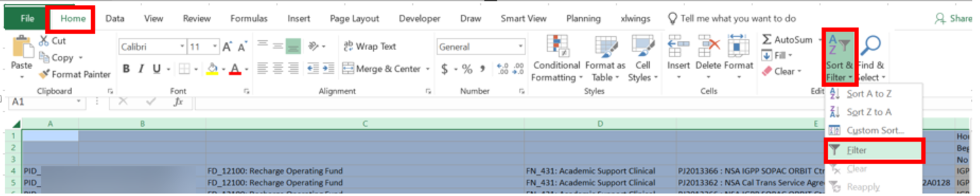 2. Select the Home tab, then select 'Sort & Filter' in the 'Editing' section, then select 'Filter':