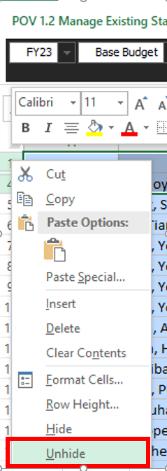 6. Right click on either row number (with rows 1-4 still highlighted) and select Unhide' from the action menu: