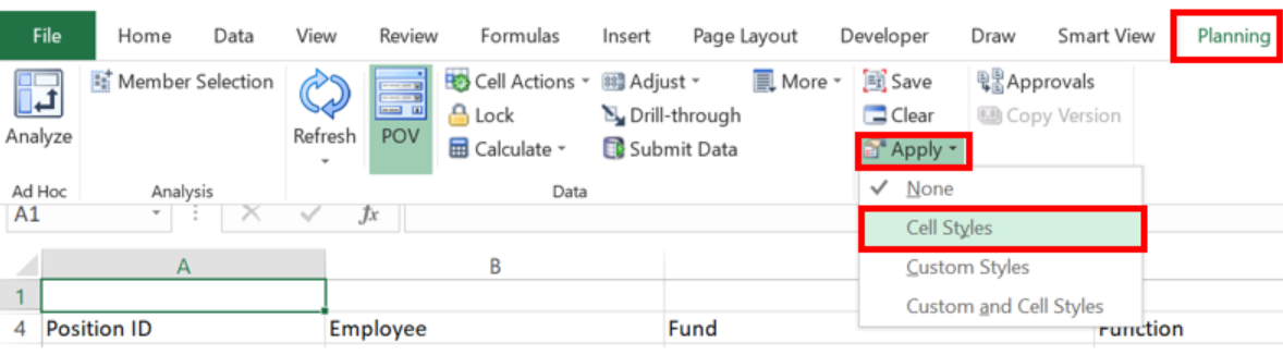 4. Navigate to 'Planning' tab in the ribbon, select 'Apply' in the 'Formatting' section, then select 'Cell Styles':