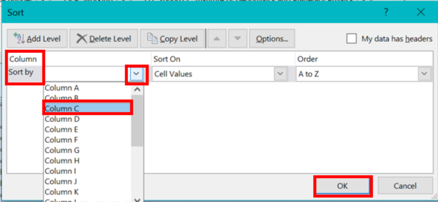 3. Within the Sort dialogue box that appears, expand the Column 'Sort by' dropdown and select 'Column C' (to sort by Fund), then Select 'OK' on the Sort window: