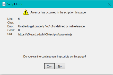 A: This Script Error dialog box is expected behavior and displays due to the interaction of SmartView with UCSD's SSO configuration and duo authentication, click Yes to proceed.
