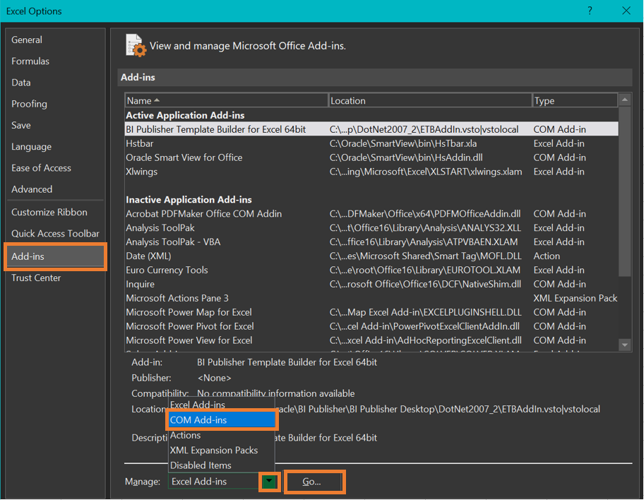 e. Select Add-Ins, at the bottom of the dialog box, click the arrow next to Manage: Excel Add-Ins, select COM Add-ins, then click Go.