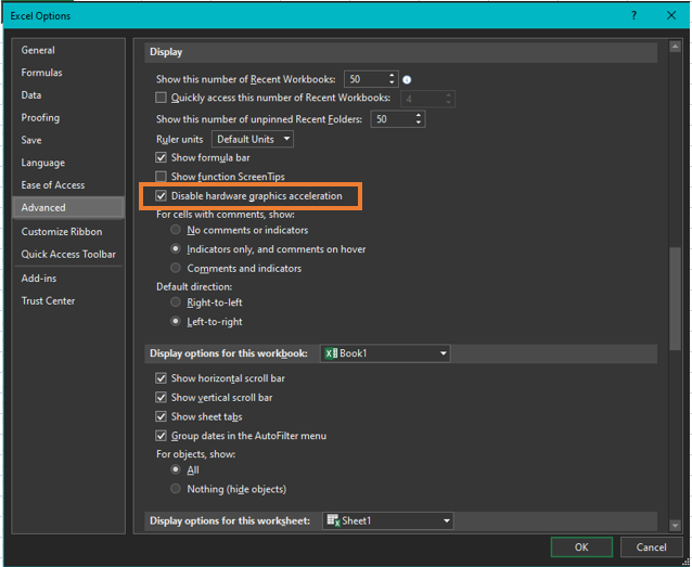 3. Select Advanced, navigate to Display and ensure the box next to Disable hardware graphics acceleration is checked.