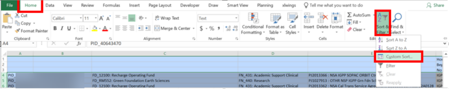 2. Within the Home tab, select 'Sort & Filter' in the 'Editing' section, and choose 'Custom Sort':