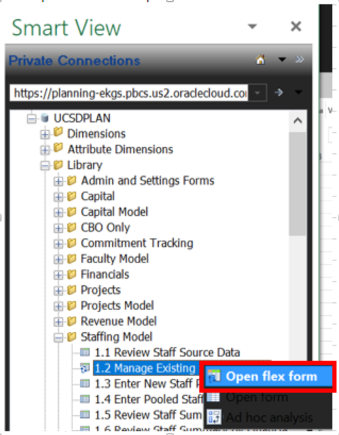 2. Locate the desired form (e.g. 1.2 Manage Existing Staff Positions), right click on it, then select the 'Open Flex Form' option from menu: