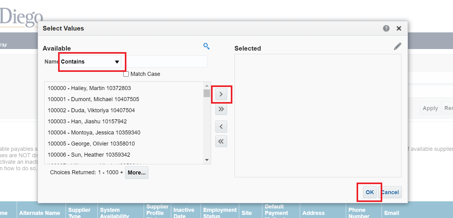 c. You can search a payee up via options of Contains, Starts, Ends, and Is-Alike. Once your payee appears, click on the arrow “>” to move your payee to the Selected Box. Once you have repeated this for all the payees you are searching for, you can click the Ok button and then click Apply.