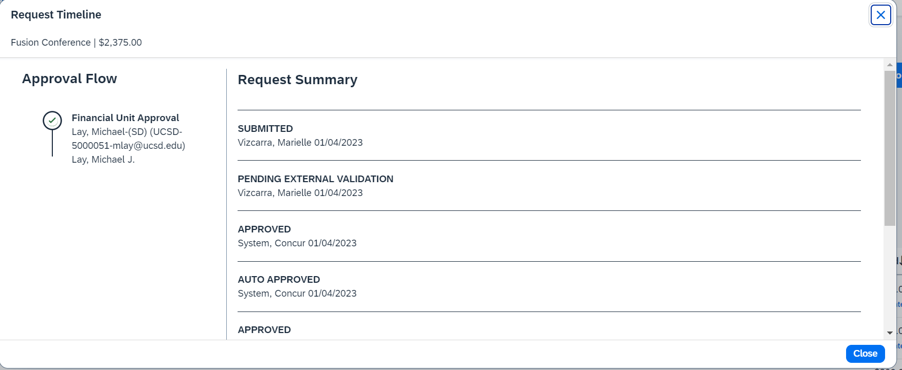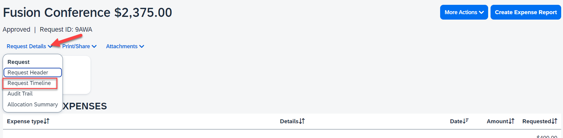 4. Select the Request Details dropdown then click Request Timeline, the Approval Flow reads from top to bottom.
