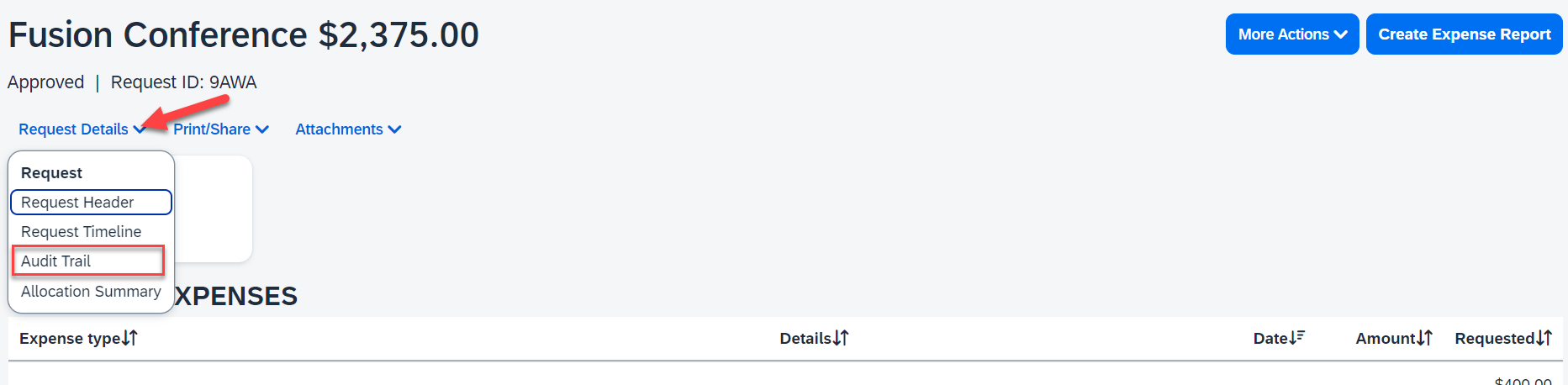 5. To view the detailed Audit Trail, select the Request Details then the Audit Trail from the drop-down menu, which provides, Date/Time, Updated By, Action and Description.