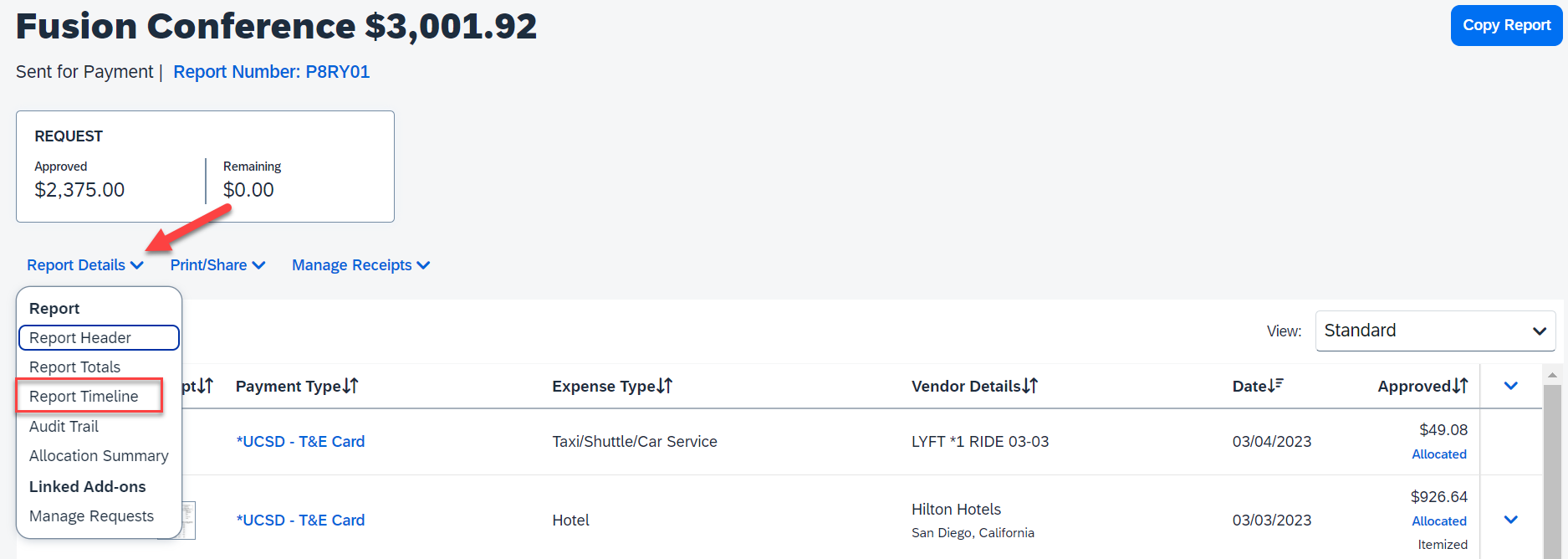 4. Select Report Details, then select Report Timeline from the drop-down menu.
